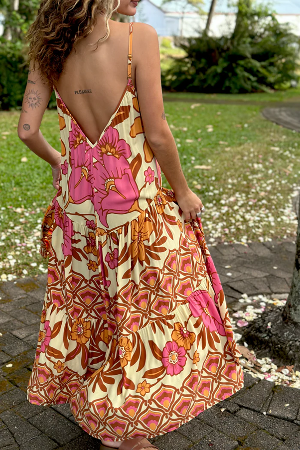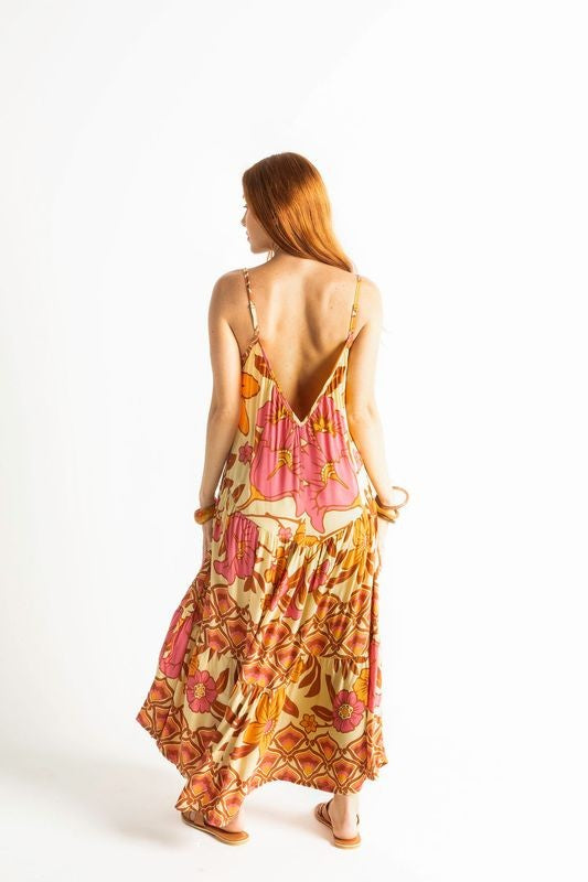 With a flattering v-neckline and low v-back, this free spirited silhouette features double frill layers trimmed in a retro border print. The adjustable straps offer a custom fit, while it's floaty shape also looks stunning cinched-in with our Bohemian Heart Wrap worn as a belt.